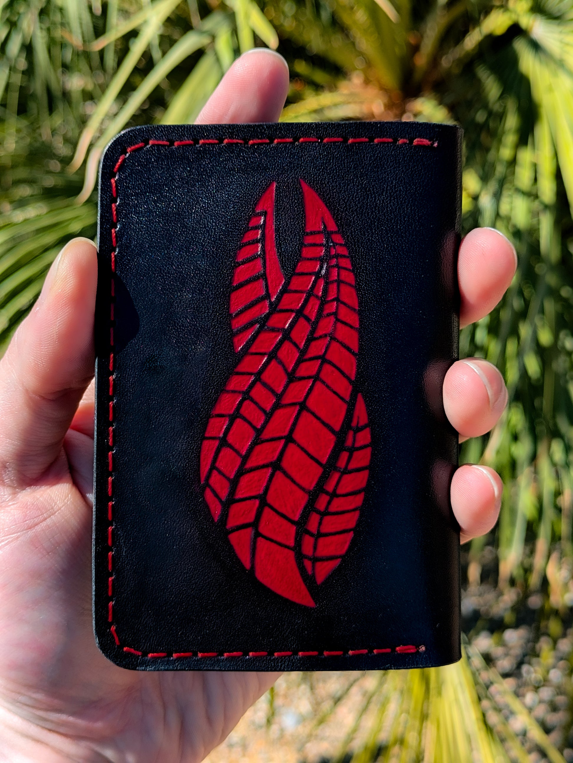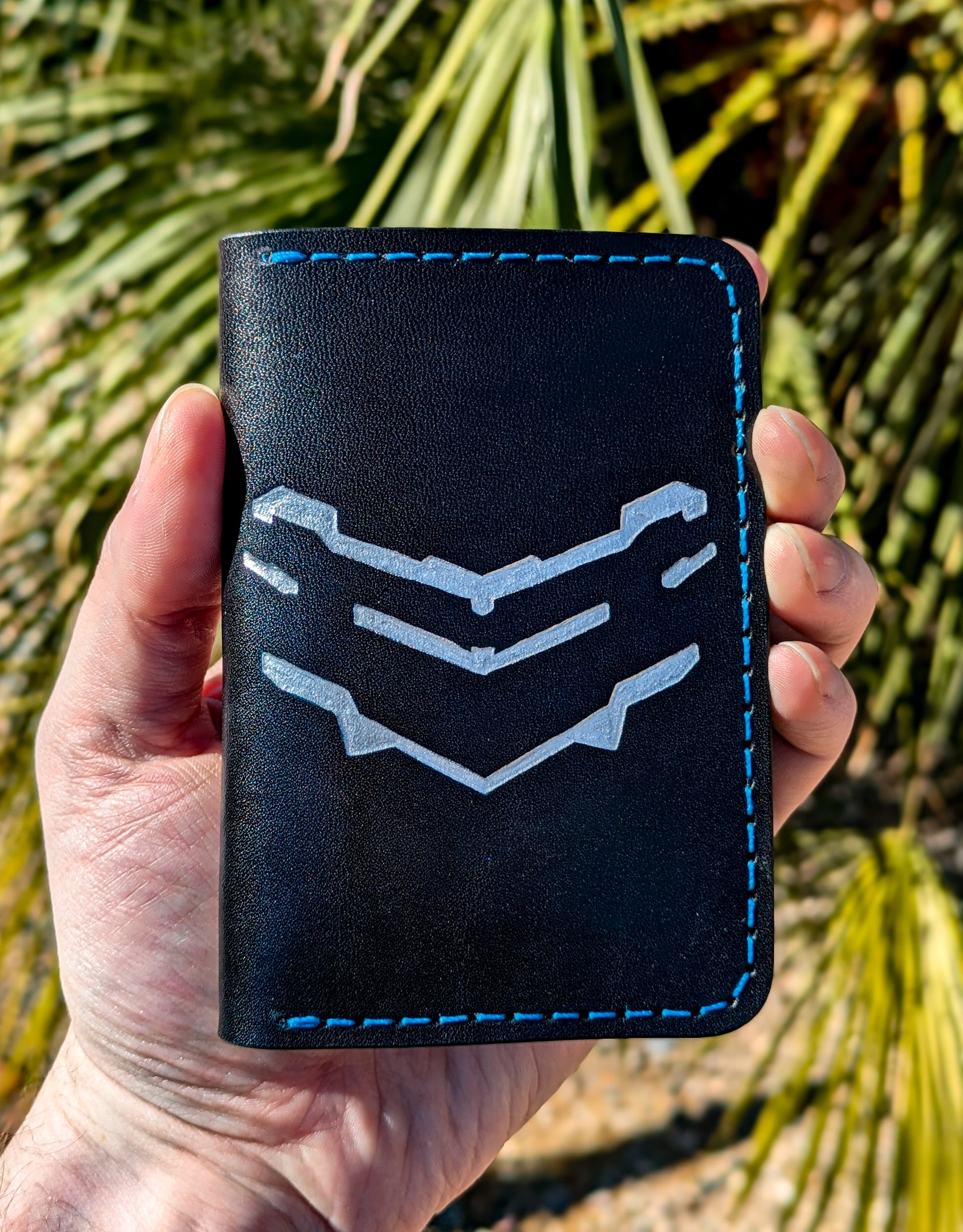 The Dead Space Screech wallet features a black, red, and blue/silver color combo with a minimalist style of Isaac's visor from the second game on the front painted silver and the infamous Marker in red on the back. The stitching and interior pockets are also in respective matching colors of blue and red.