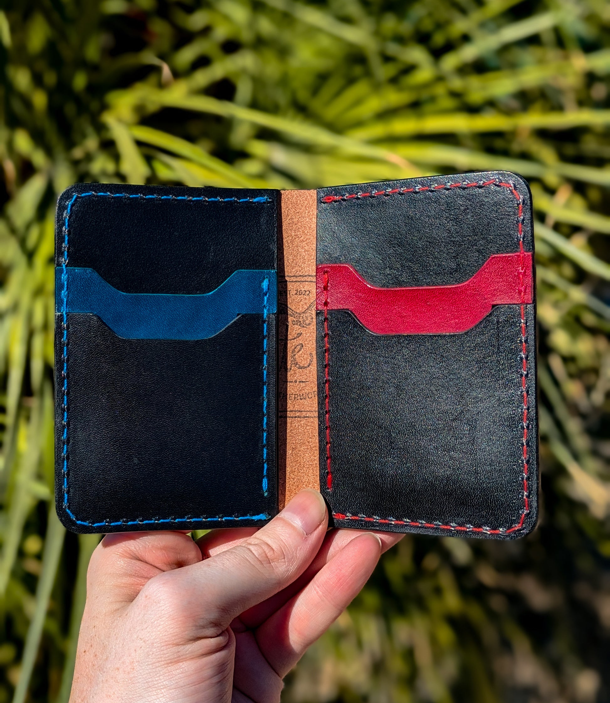 The Screech is a 6 pocket vertical wallet able to hold multiple cards and folded cash in a sleek and compact hand and pocket feel. Made from top quality, 100% full-grain vegetable tanned leather, carefully engraved and dyed by hand.
