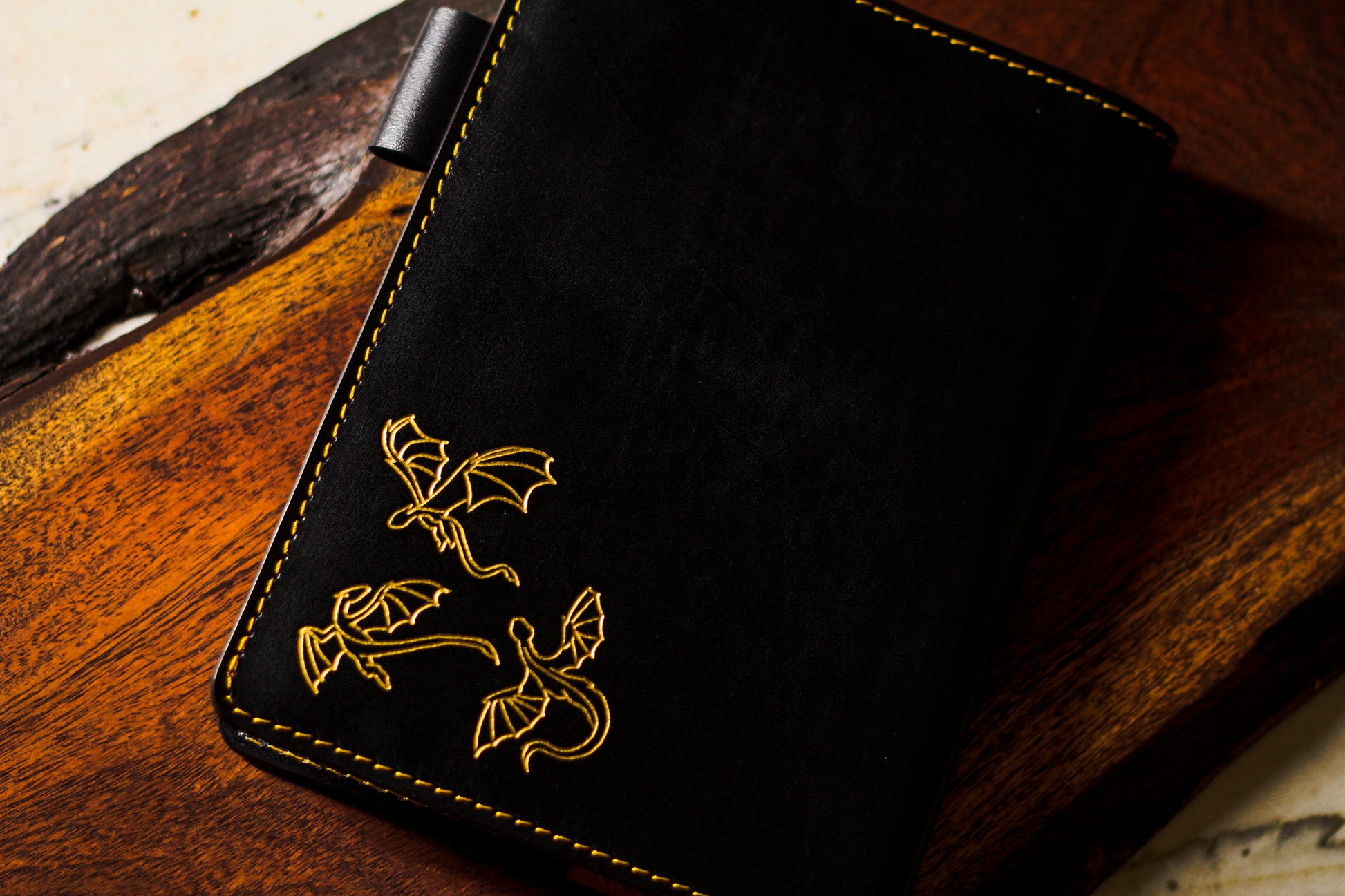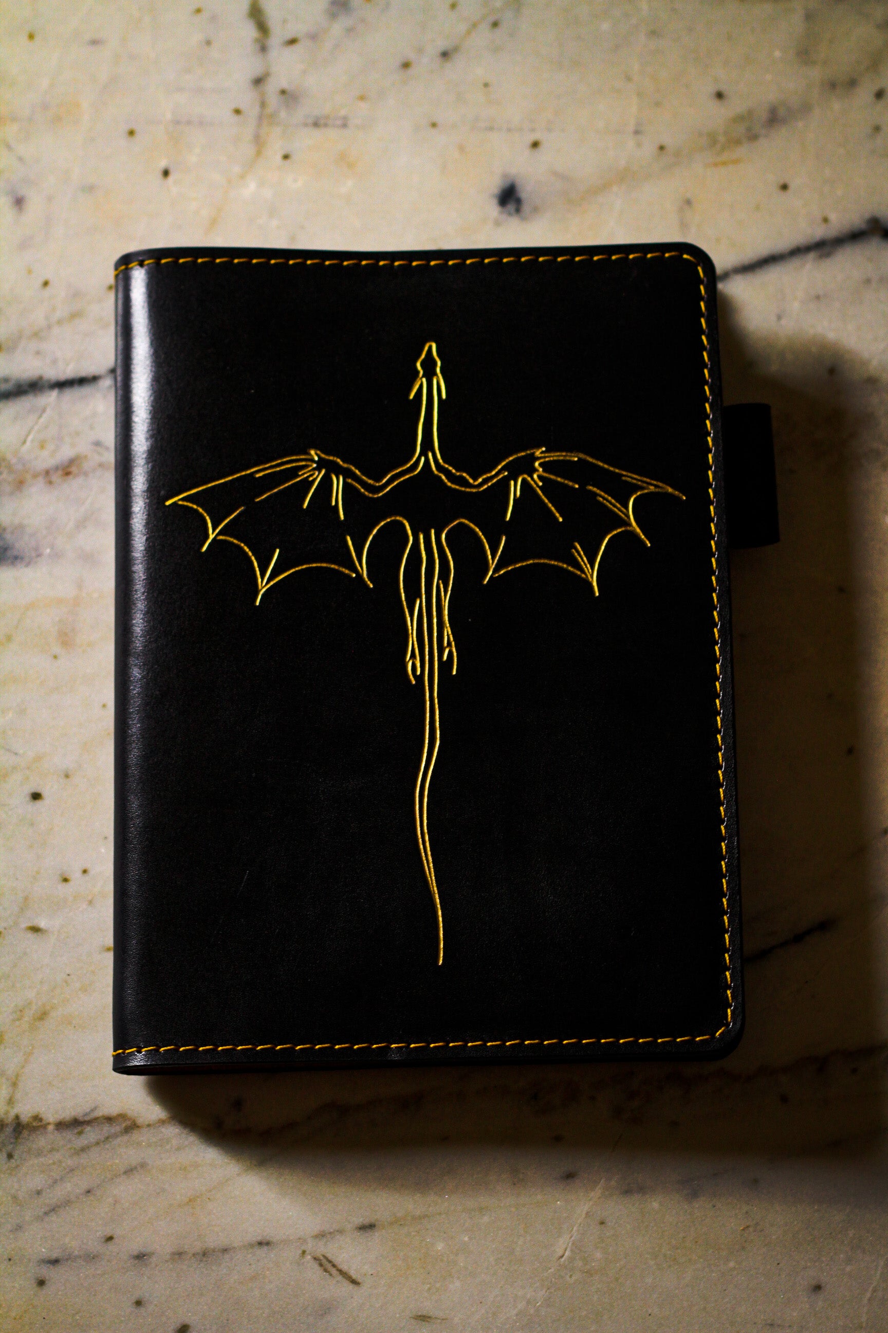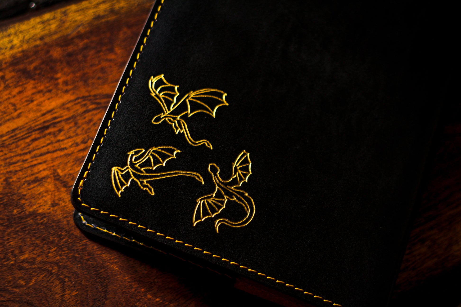 Featuring the dragon in flight design on the front and baby dragons playing on the back corner in black and gold.