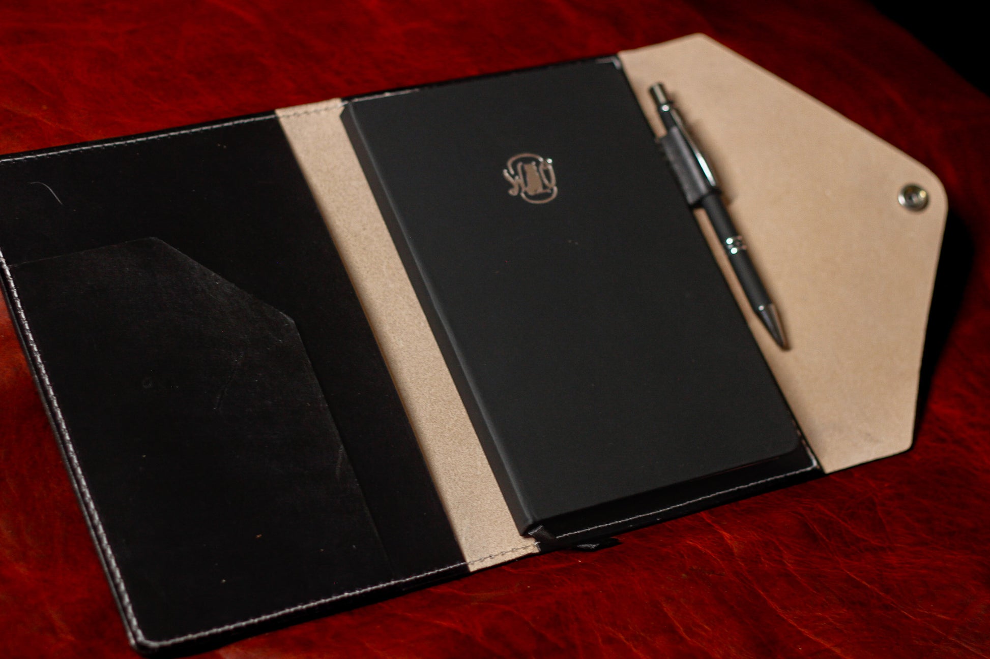 This Clear Skies Series A5 journal cover includes a White Owl journal, pen loop, and left pockets for loose papers and notes and locks with an envelope snap closure.
