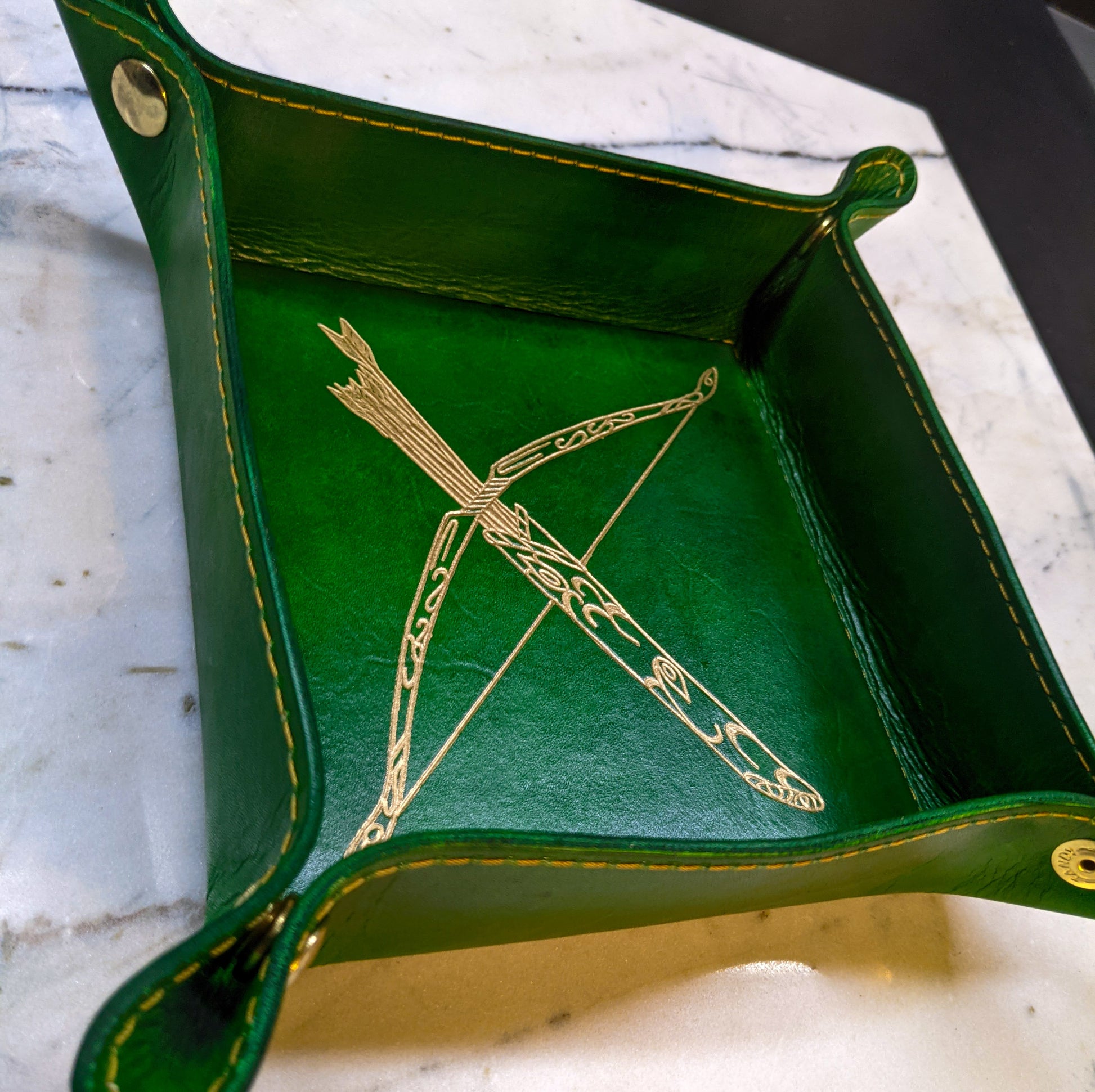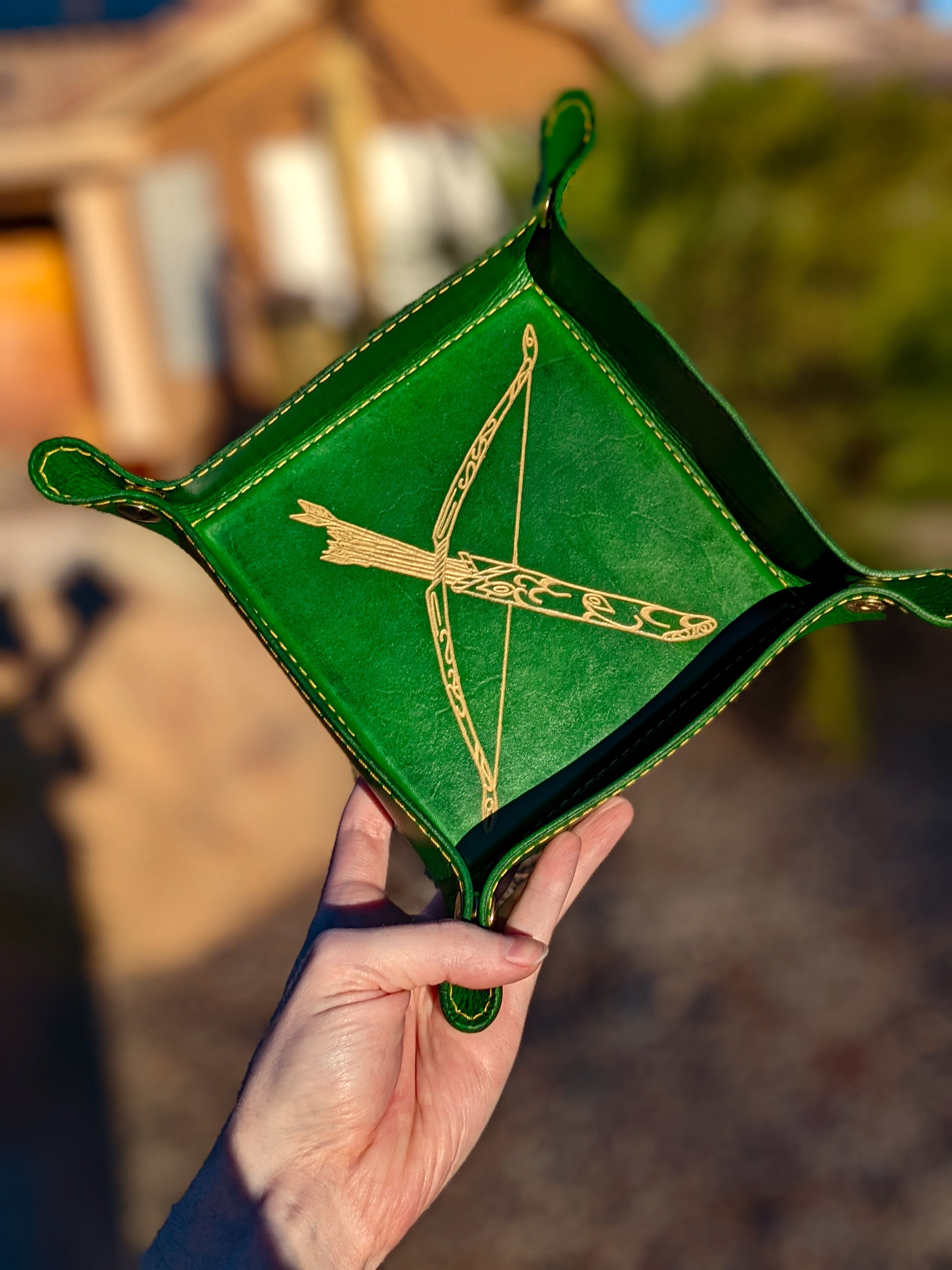 Featuring an elegant elven-styled crossed bow and quiver hand-engraved and hand-painted in gold on a forest green background with gold thread and corner snaps.