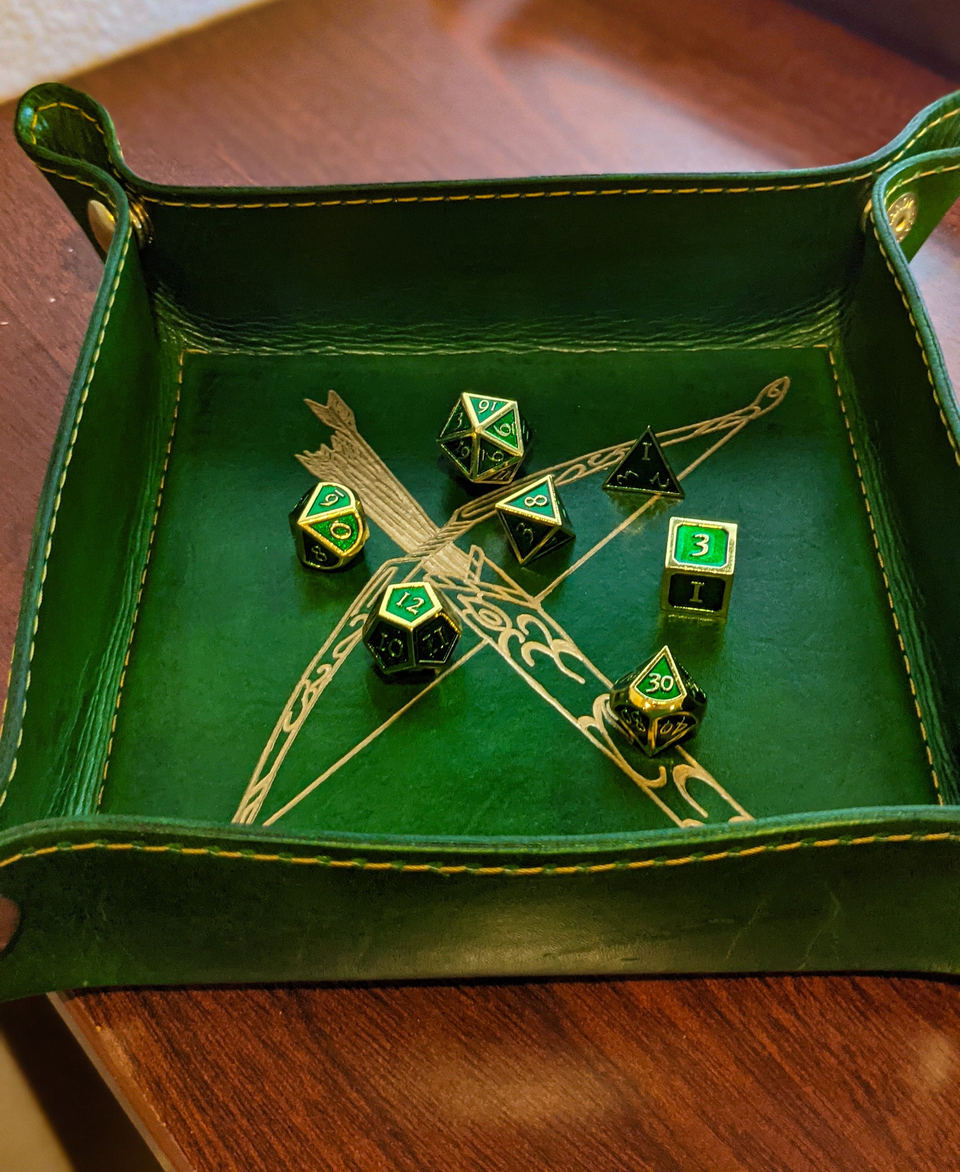 White Owl dice trays are double-layered full-grain leather with a stiff cardboard base for a uniform, flat surface to roll on and collapsible with corner snaps for flat storage.