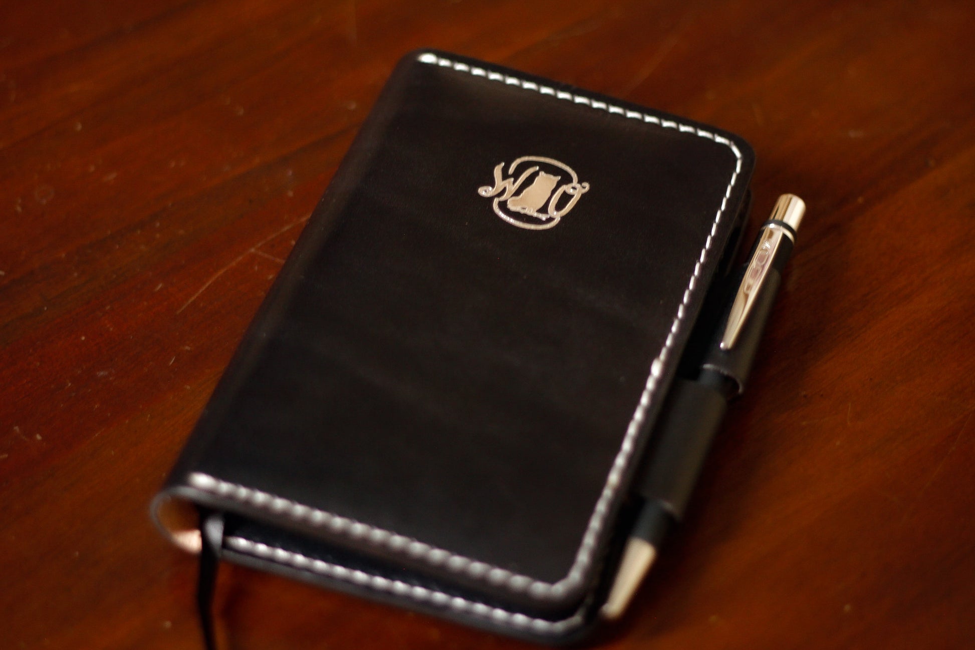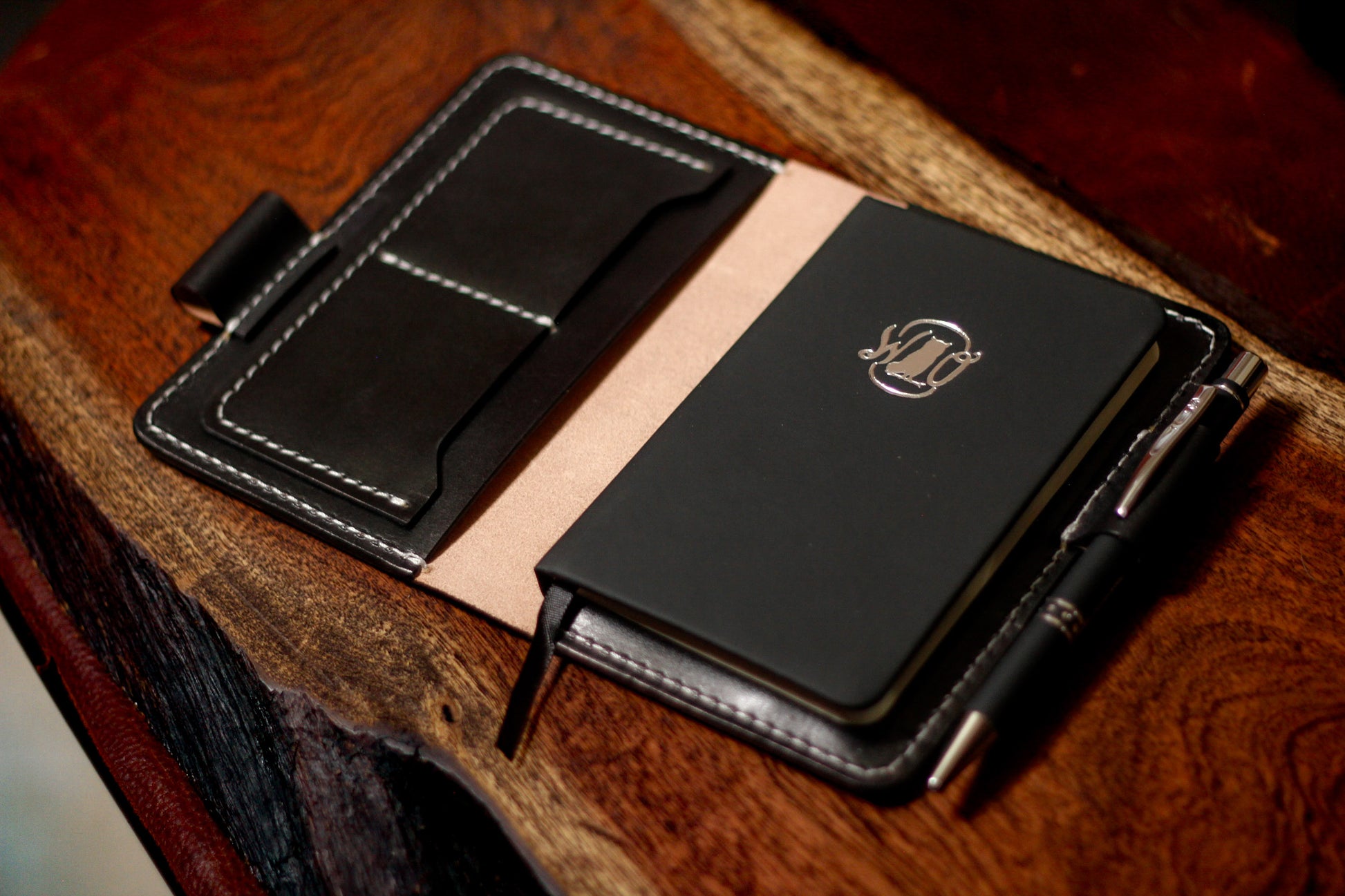 The Stygian West is pocket journal carrier/wallet with 2 card slots, a pocket underneath for extra cards, cash, or loose notes, and a double pen loop locking closure.